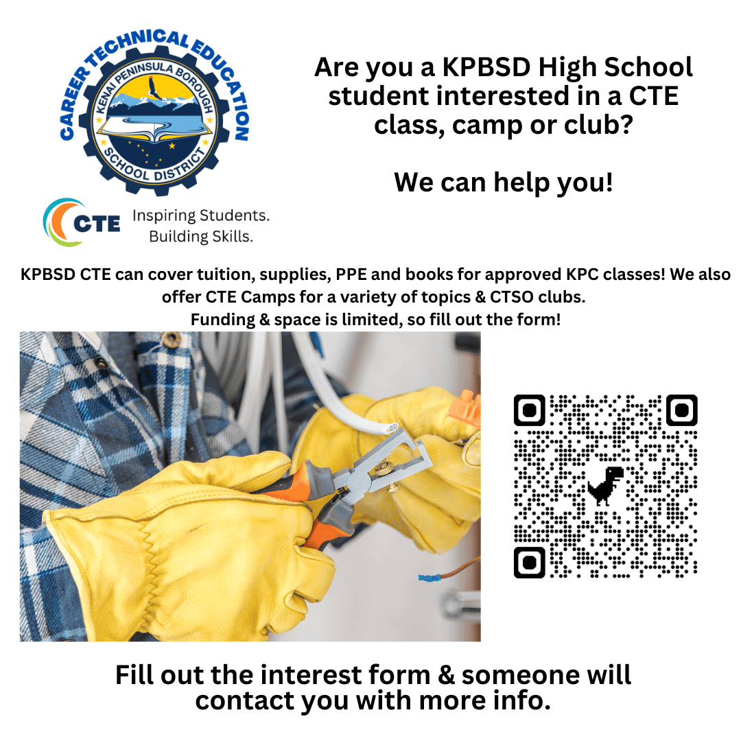 | Central Peninsula | Fall or Spring KPC CTE Courses – Welding, EMT, Petroleum | In Person at KPC – Soldotna or online! | Semester based classes at KPC | As scheduled by KPC. | Signup through Google Form *Requires additional paperwork with KPC |