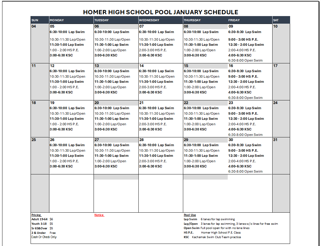 Kate Kuhns Aquatic Center January Pool Schedule Kate Kuhns Aquatic Center600 E. Fairview Ave.Homer, AK 99603 907-235-7416 – Pool Direct Phone kgraham@kpbsd.k12.ak.us