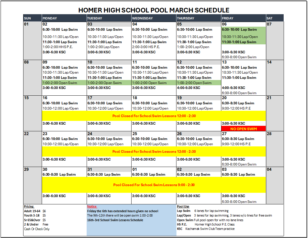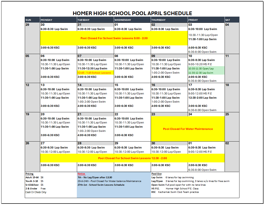 Kate Kuhns Aquatic Center March Pool Schedule Kate Kuhns Aquatic Center600 E. Fairview Ave.Homer, AK 99603 907-235-7416 – Pool Direct Phone kgraham@kpbsd.k12.ak.us