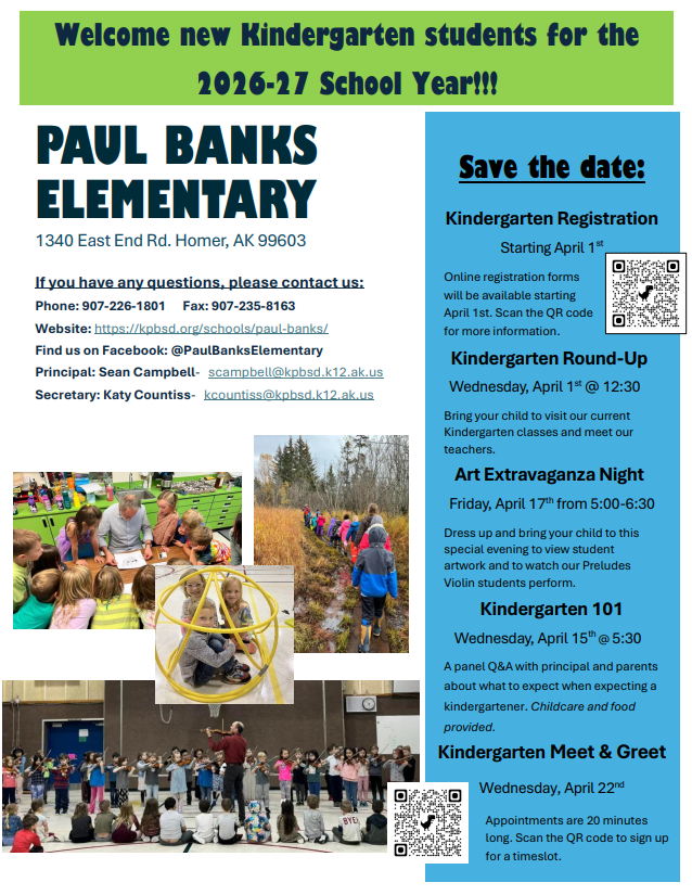 Registration Packets: All registration paperwork is available online, we don’t have paper forms anymore. Registration packets for next school year will be available starting April 1st. Please wait until after this date to fill out the online forms, otherwise you will be filling out forms for this current school year. More information and the link to the online forms can be found on the KPBSD Registration page: https://kpbsd.org/students-parents/student-registration/.
