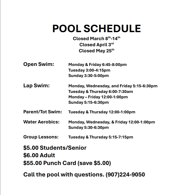 Pool Schedule January-May 2026