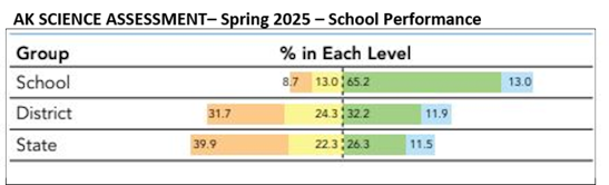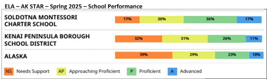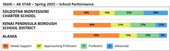 Soldotna Montessori students’ performance on the State PEAKS assessment compares favorably to district and state results in English-Language Arts, Math, and Science.