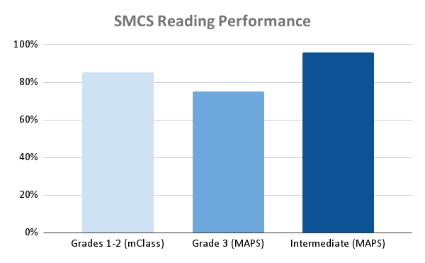 Students in our primary grades do well on the district reading fluency assessment (mClass), and develop additional competency throughout the course of their education from later intermediate classroom instruction and application through their research and project-based learning.